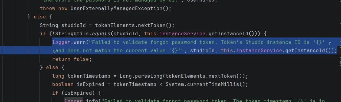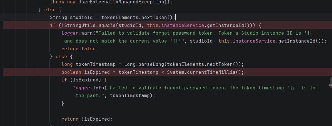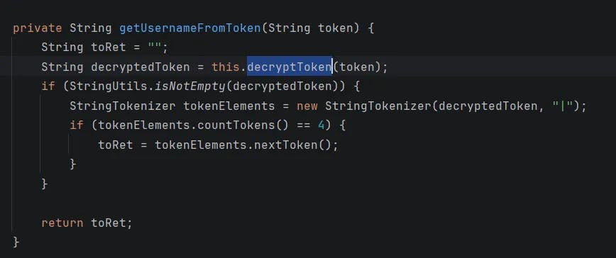 Every token verification step lives inside the validateDecryptedToken function. First, the token is split using the "|" delimiter, and the application checks whether it contains exactly four parts.