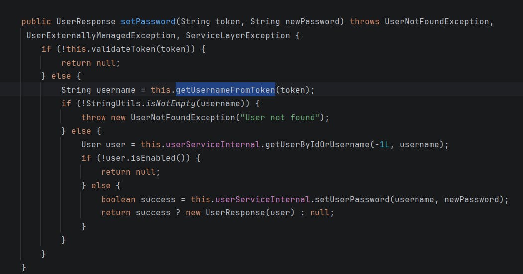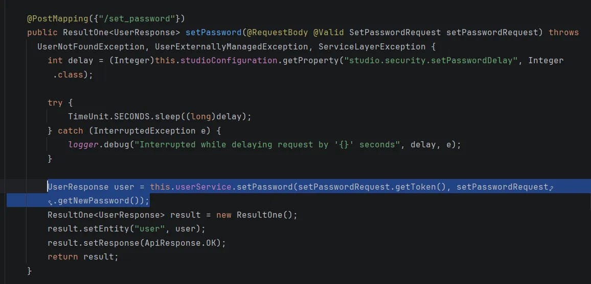 We will focus on the reset password API, which is in the org.craftercms.studio.controller.rest.v2#setPassword function
