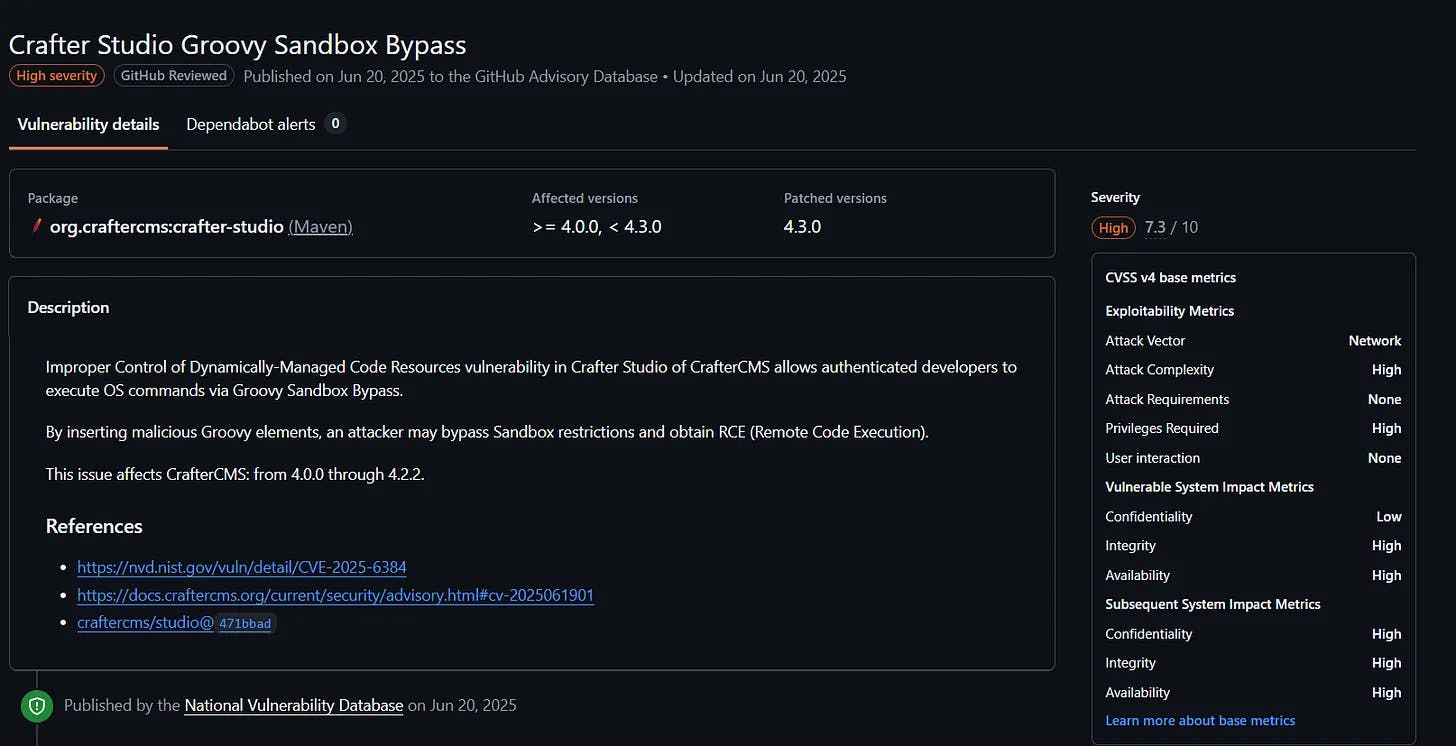 And if that rings a bell, it should. CrafterCMS has a proud history of CVEs involving Groovy templates being used to execute system commands, such as CVE-2025-6384. History doesn’t repeat itself, but it definitely likes to reuse Groovy.