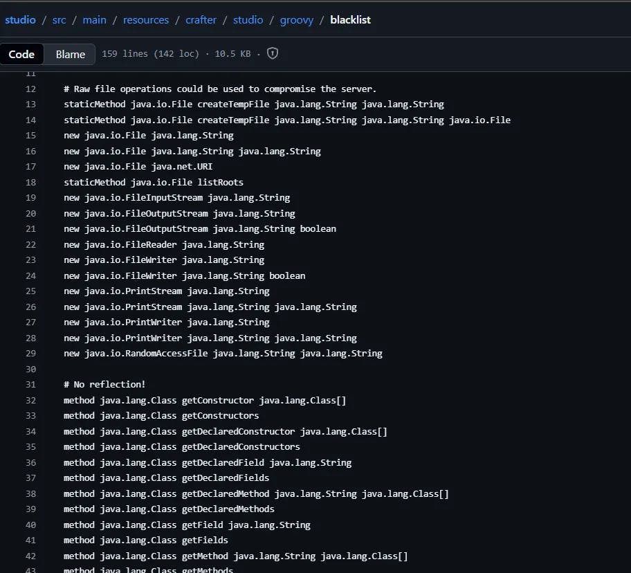 To prevent it, they added many blacklist classes in https://github.com/craftercms/studio/blob/729a1555d42c14b330d9844740f14b7116c717f4/src/main/resources/crafter/studio/groovy/blacklist