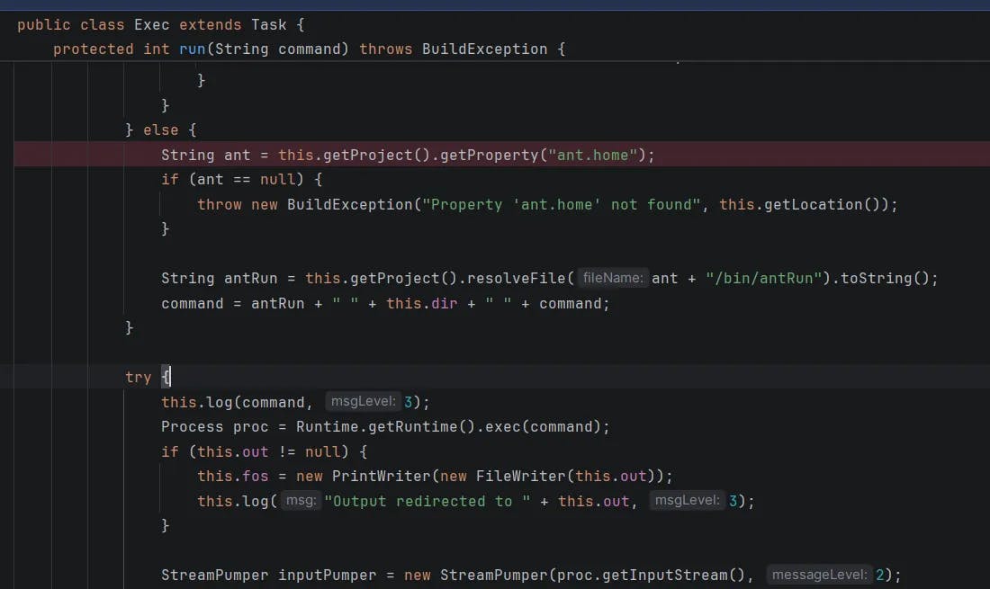 The implementation retrieves the ant.home property from the project configuration, appends /bin/antRun, and executes the resulting command. By creating a new project and setting the ant.home property to an arbitrary command, then reloading the project, we achieve remote code execution.
