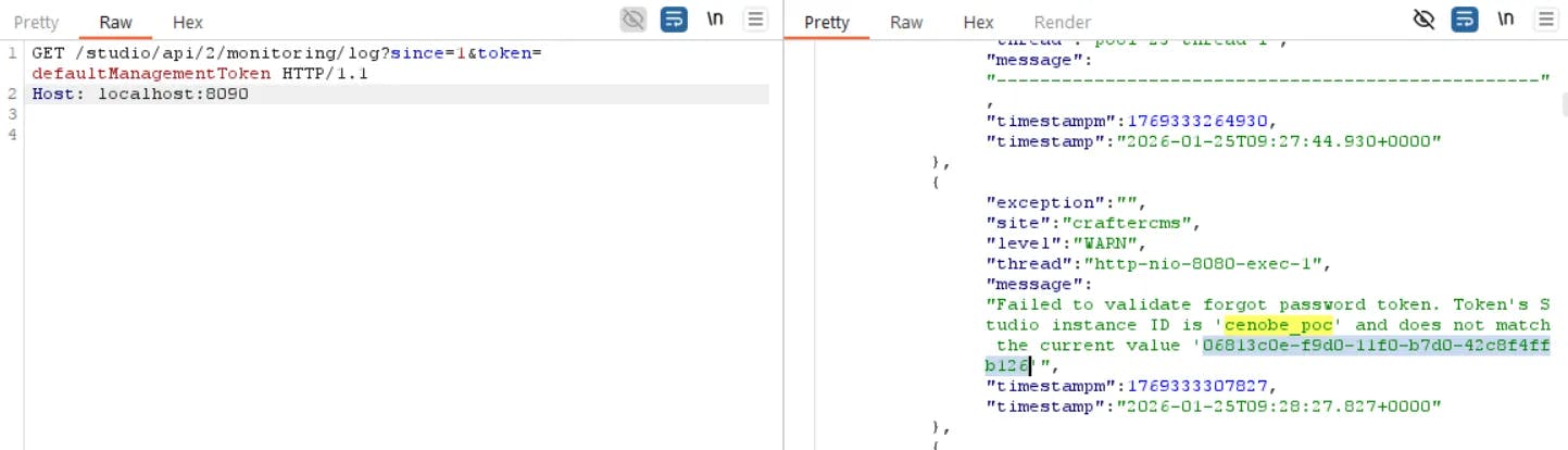 At this point, we send an initial request using a placeholder instance ID (cenobe_poc) in order to trigger the application into revealing the actual instance ID.