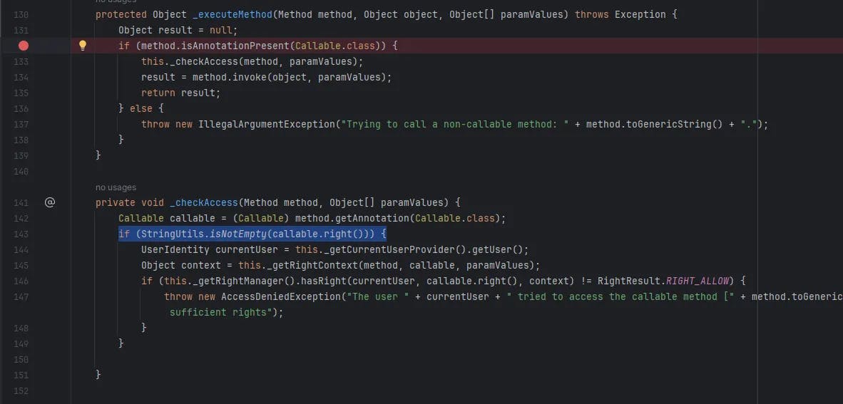In org.ametys.core.ui.ExecuteClientCallsAction, when a method is invoked, it checks whether the method is annotated with @Callable. If so, it passes through the _checkAccess function. If a non-empty "callable right" is defined, the system verifies whether the current user has the necessary permissions to execute the method.