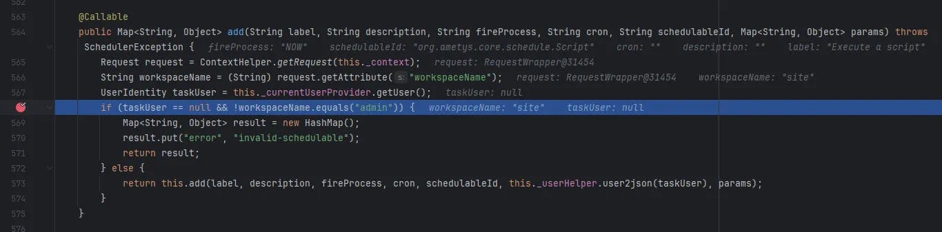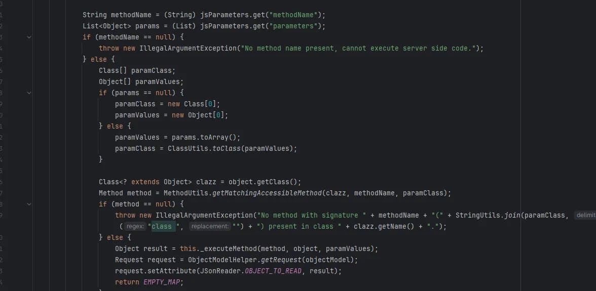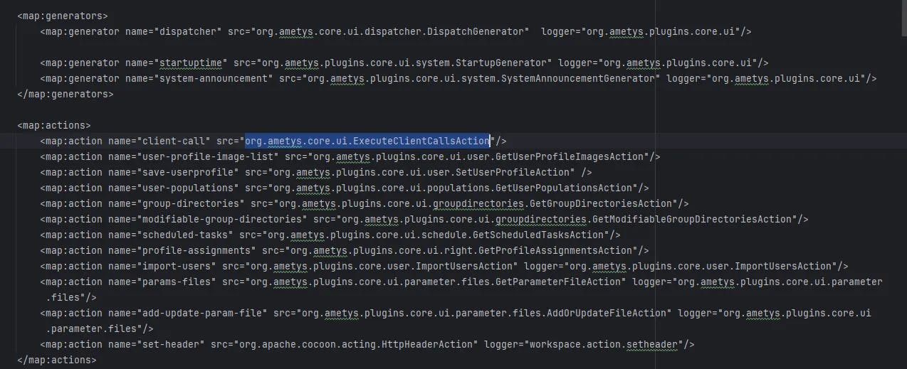 Digging deeper into the request flow, we noticed that the client-call action was a promising entry point. This is handled by the class org.ametys.core.ui.ExecuteClientCallsAction