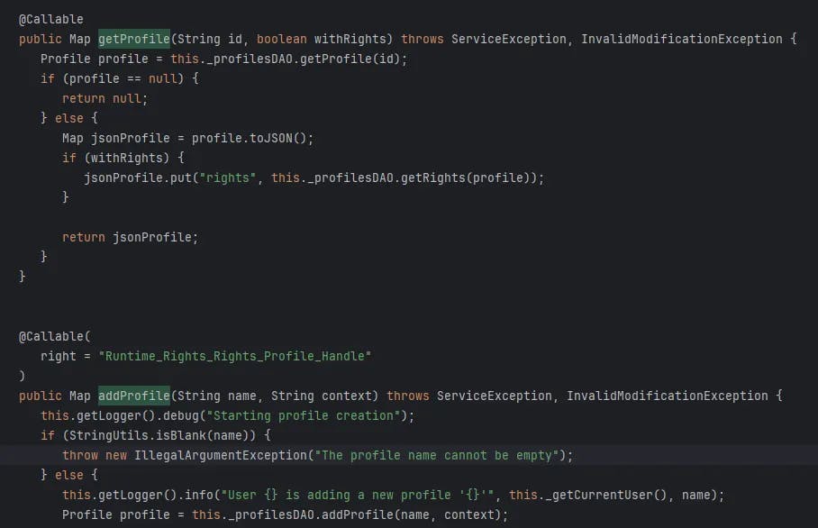 In short, for example, we can call the method org.ametys.plugins.core.right.profile.ProfileDAO#getProfile without permission, but we need Runtime_Rights_Rights_Profile_Handle to call org.ametys.plugins.core.right.profile.ProfileDAO#addProfile.