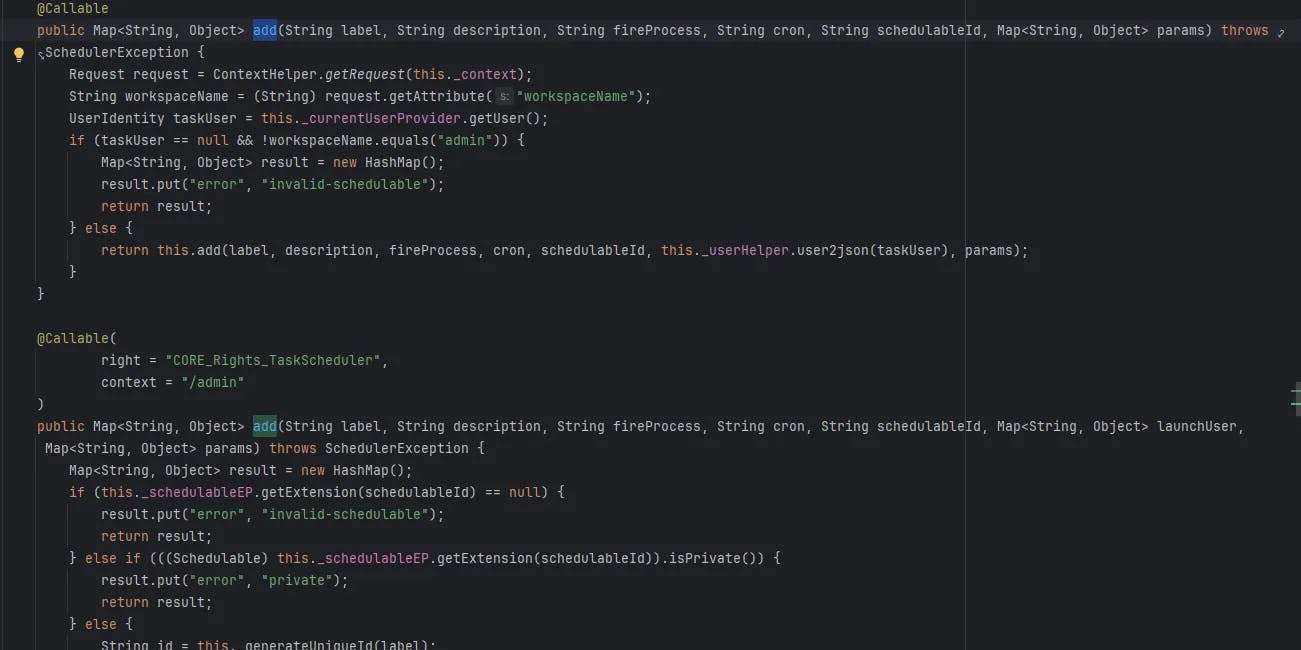 Takeaway: The Scheduler path exposes an unprotected add overload. If we can impersonate a user, it turns into unauthenticated RCE.